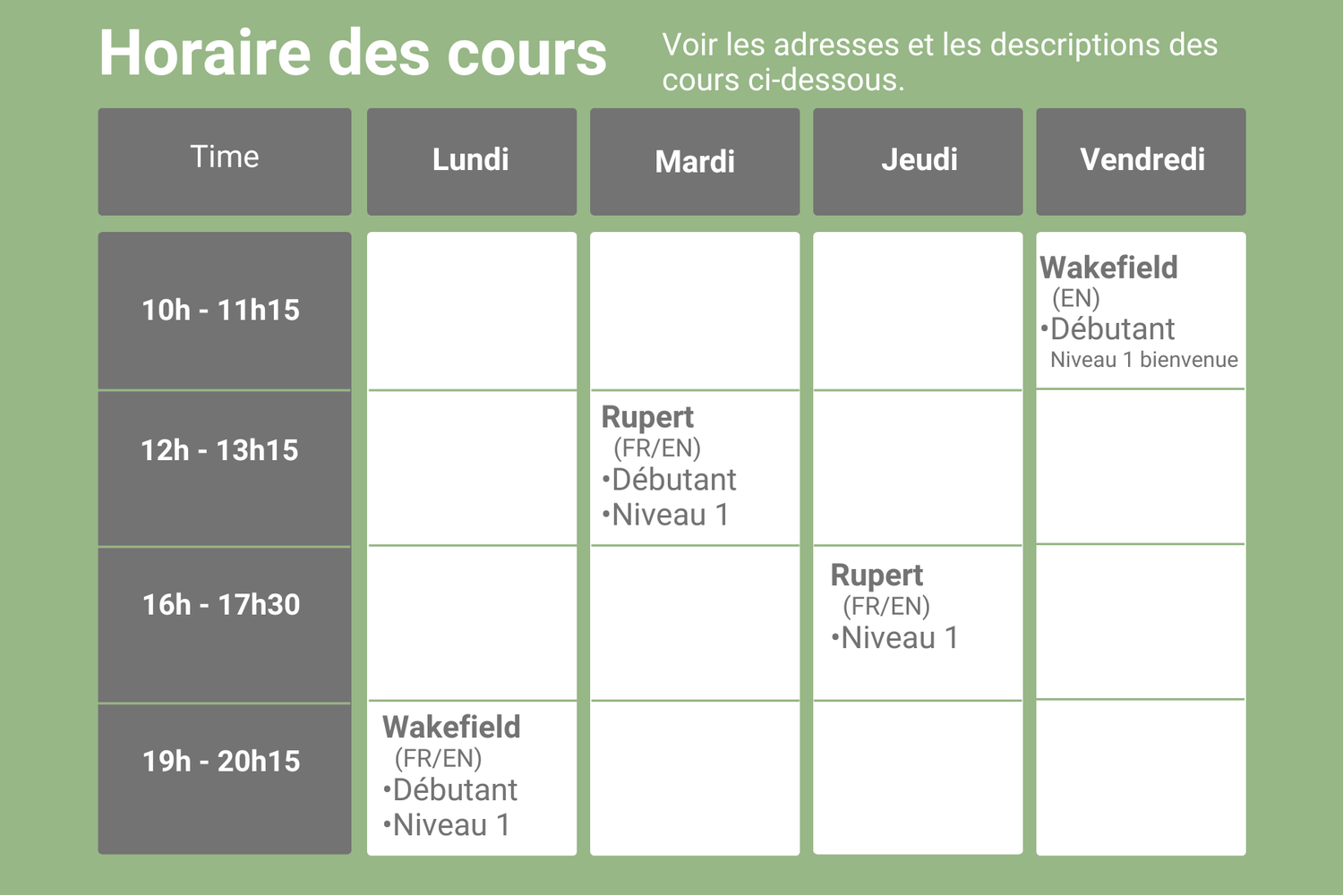 nos cours à Rupert et Wakefield!